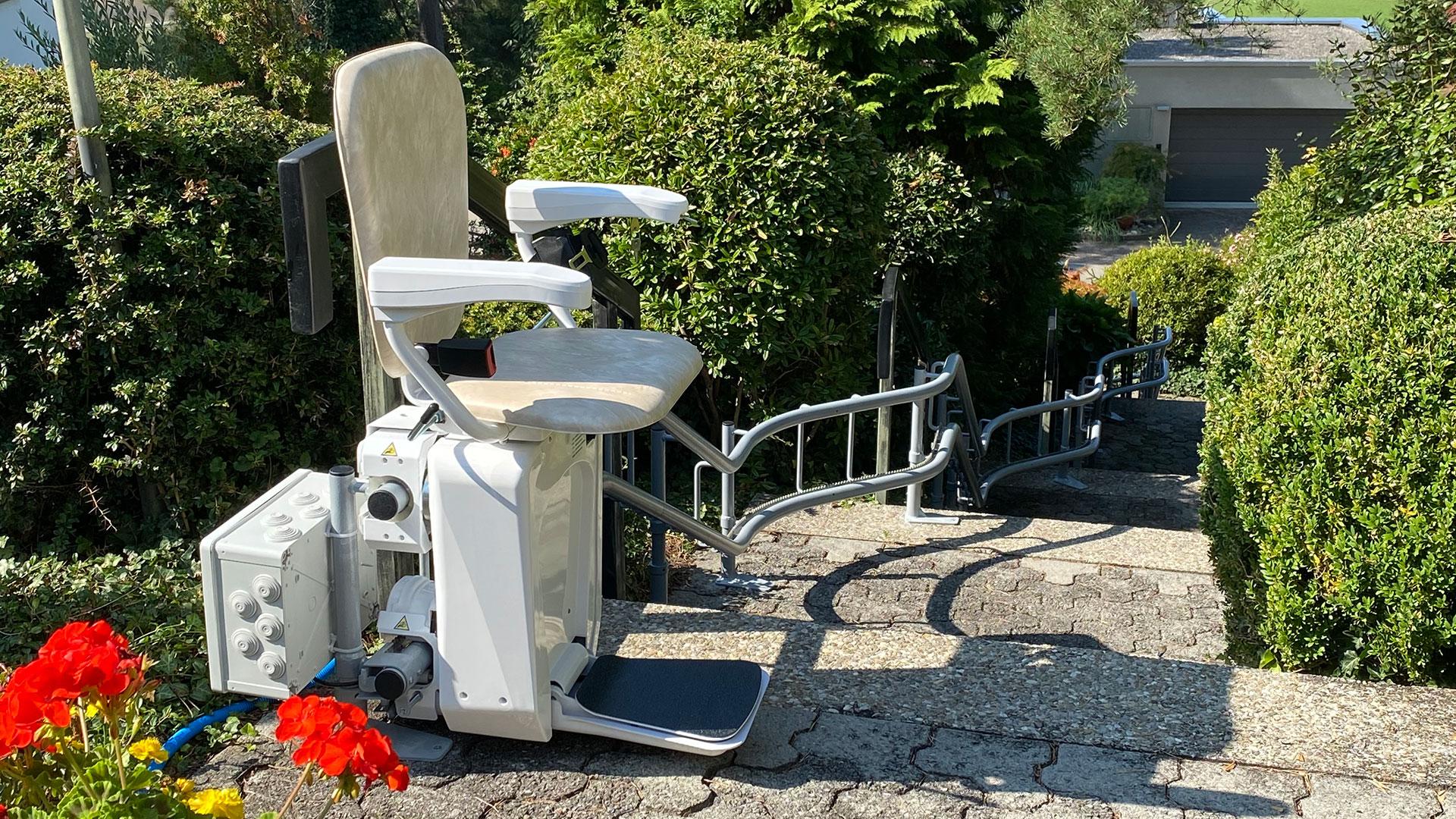 Bei geraden Treppenverläufen im Außenbereich kommen in der Regel Sitz-Treppenlifte zum Einsatz, die speziell für Witterungseinflüsse ausgelegt sind. Voraussetzung ist ein gleichmäßiger Treppenverlauf ohne Kurven oder Podeste.