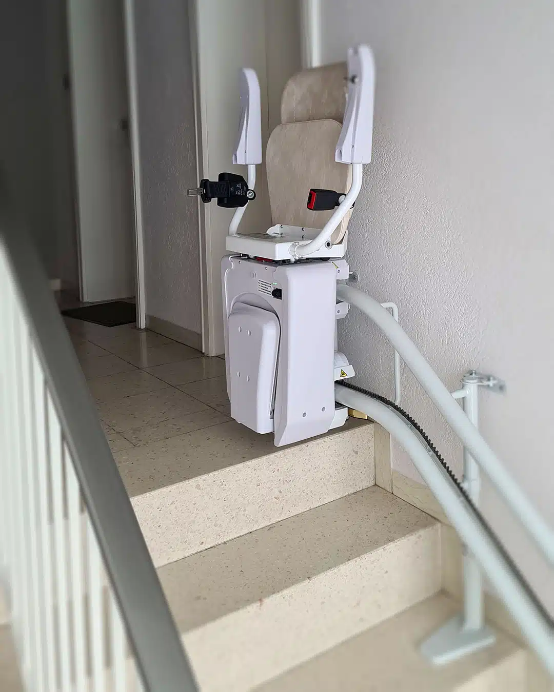 In 86316 Friedberg haben wir einen Lehner Alpha Classic Kurventreppenlift in Beige installiert, der mit einer speziell angefertigten Kurve oben endet. Dieser Lift ist besonders benutzerfreundlich konzipiert mit einem elektrischen Fußbrett und einer Steuerung, die auf der linken Seite angebracht ist, um der Kundin, die ihre rechte Körperhälfte nicht bewegen kann, maximale Unabhängigkeit zu bieten.