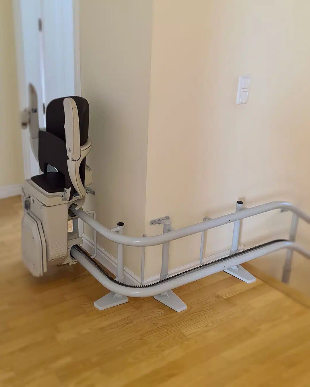 In 86179 Augsburg haben wir einen Kurventreppenlift Handicare Freecurve mit Einrohr-System und Stufenbefestigung installiert. Der Lift ist mit einem elektrischen Fußbrett ausgestattet, das den Komfort beim Ein- und Ausstieg erhöht. Der elegante Alliance-Sitz in Perlweiß mit braunen Holzelementen fügt sich harmonisch in das bestehende Wohnambiente ein.