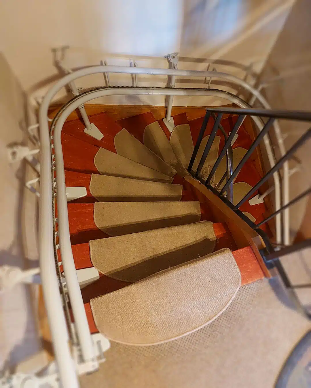 In 82436 Eglfing haben wir einen gebrauchten Kurventreppenlift Handicare Freecurve mit einem Einrohr-System installiert. Die elektrische Klappschiene sorgt dafür, dass der untere Treppenbereich immer frei bleibt, da sie sich automatisch hochklappt, wenn der Lift in Bewegung ist.