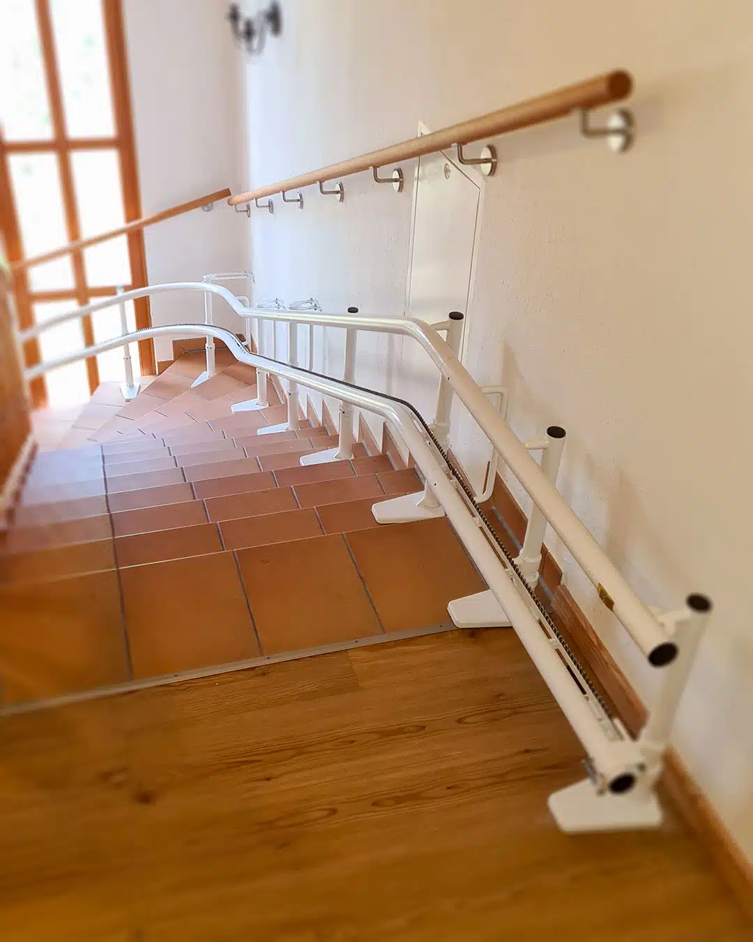 In 86899 Landsberg am Lech haben wir einen gebrauchten Kurventreppenlift installiert. Anstatt die Stützen in die Stufen zu verbohren, wurden Wandhalter verwendet, um die Schiene sicher an der Wand zu befestigen. Zudem wurde eine zusätzliche Haltestelle installiert, um den Lift bei Bedarf über die nahegelegene, nicht genutzte Tür hinausfahren zu lassen, was den Eingangsbereich frei hält.